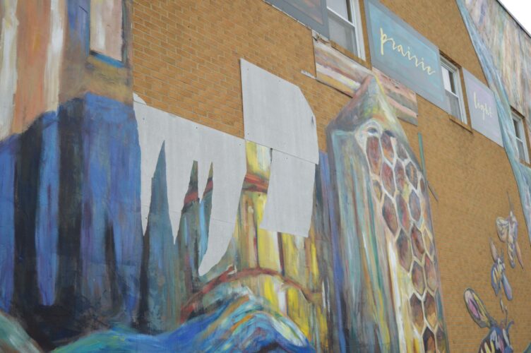 At the corner of Main and Third Street, artwork celebrating Marshall area history has sections of peeling or missing paint, while some panels of the image are gone.