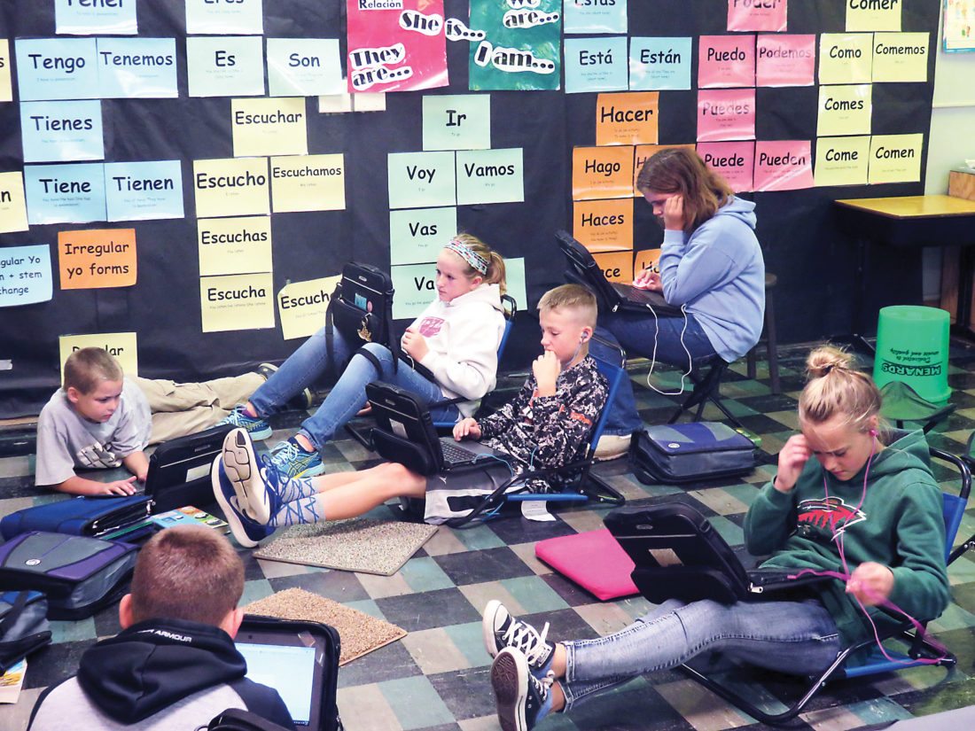 Photo courtesy of Anna Lenz Sixth-grade students are shown using Chromebooks and flexible seating while learning Spanish in Haley Chace’s classroom at Holy Redeemer School in Marshall.