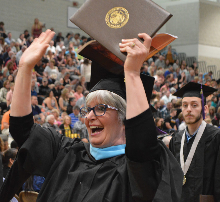 Education master’s of science graduate Julie Kupfer enthusiastically raises her diploma high in the air during the recessional at Southwest Minnesota State University’s 49th Annual Commencement on Saturday.