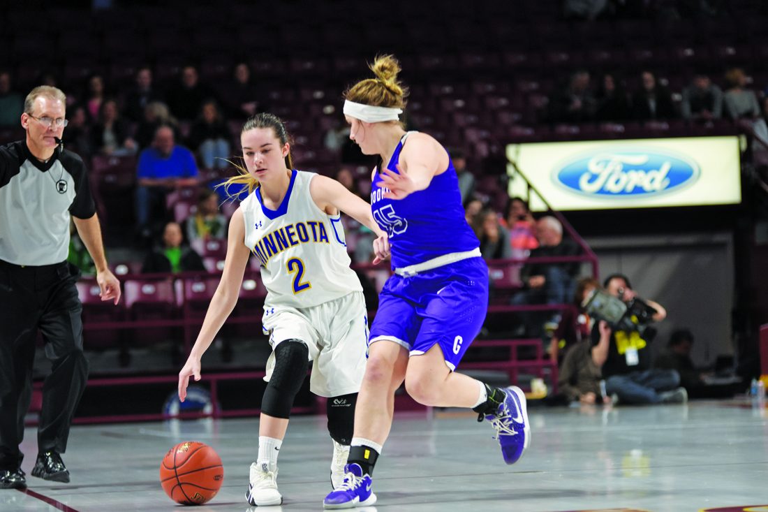 Independent file photo Minneota’s Morgan Kockelman brings the ball upcourt during their Class A championship game against Goodhue on Saturday.