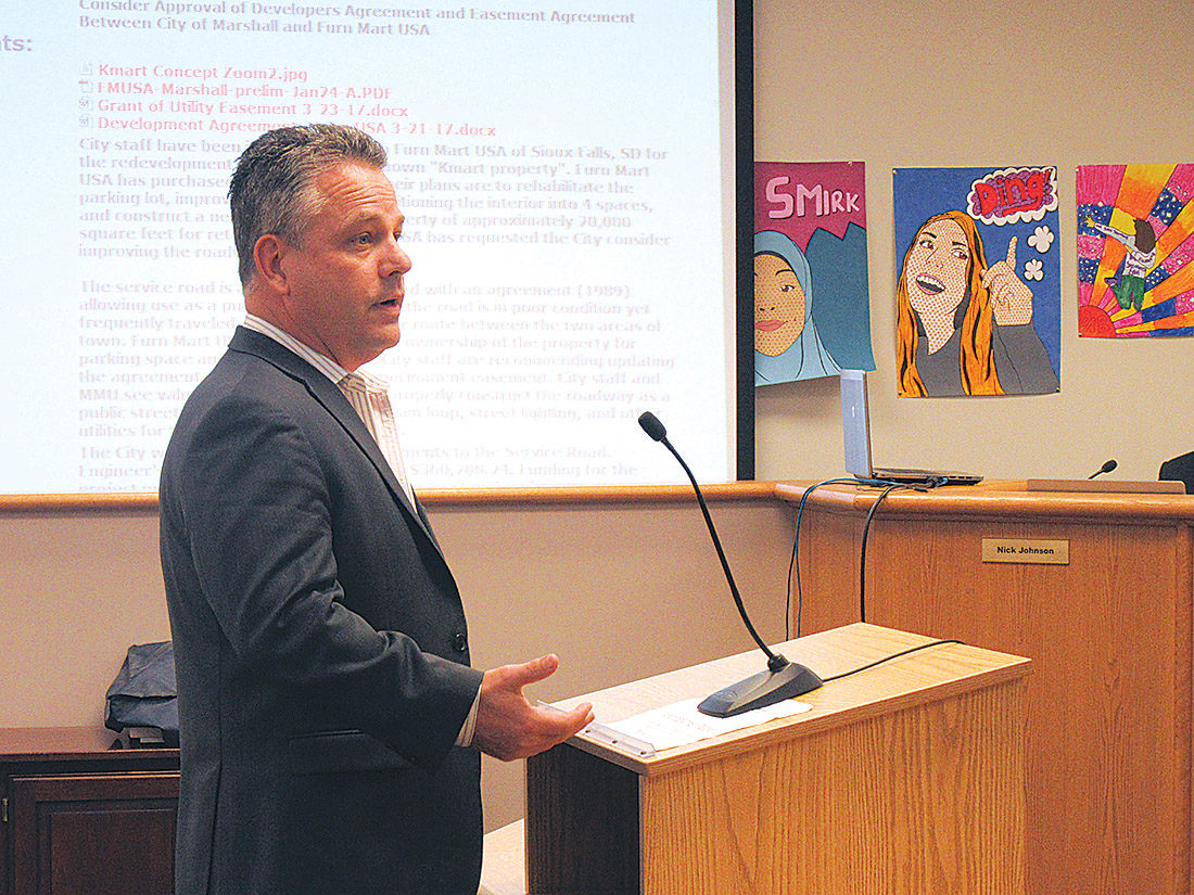 Photo by Deb Gau Troy Eichmann, chief operating officer of The Furniture Mart USA, spoke to members of the Marshall City Council about plans to redevelop the old Kmart property in Marshall.