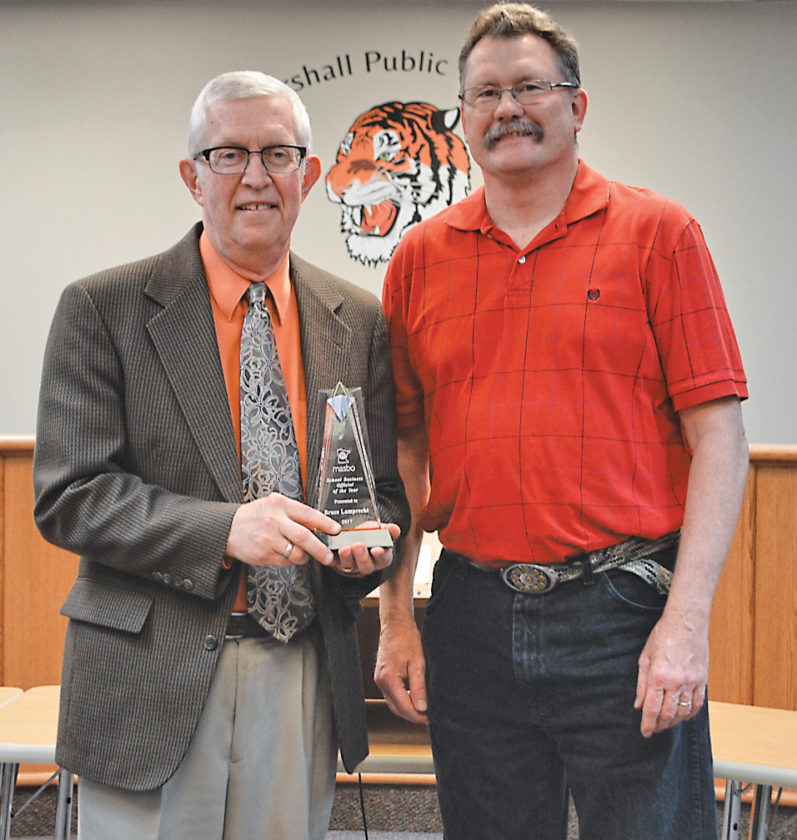 Photo by Jenny Kirk Marshall School Board Vice Chairman Matt Coleman, right, presents the Minnesota Association of School Business Official of the Year award to Bruce Lamprecht, who is the district’s director of business Services.