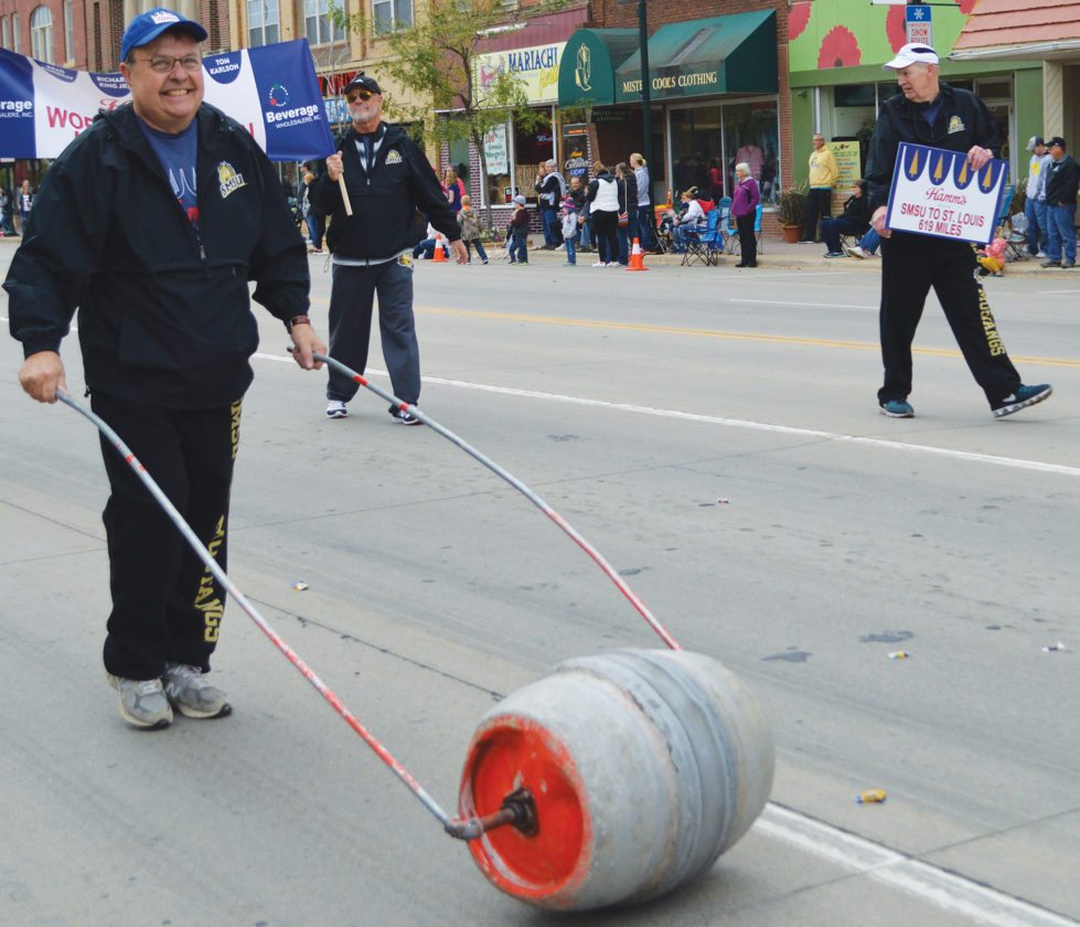 Photo by Jody Isaackson Members of the original barrel rolling team from 1970 roll the original keg in the SMSU Homecoming Parade in Marshall Saturday morning. Thomas Karlson is shown taking his turn behind the ‘wheel’ while other members marched alongside. See more parade photos on Page 8A.