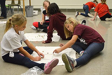 Photo by Jenny Kirk Minneota student Jersey Stensrud, left, and Yellow Medicine East student Emma Keller play a game of marbles — after making their own to take home — during the 2017 Conference for Young Artists on Thursday.