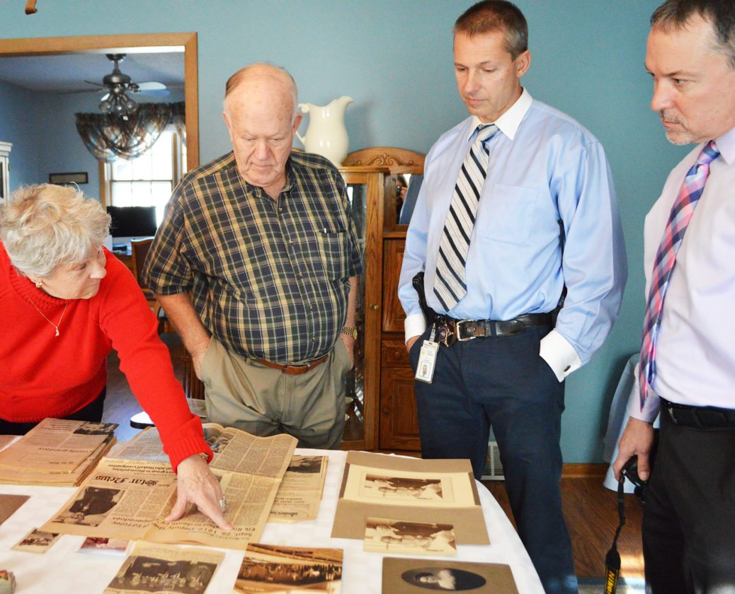Photos by Jody Isaackson Visitors from the Sherburne County Sheriff’s office were guests of Pat and Doris Foley of Marshall Wednesday to view the collection of memorabilia Foley had from his late grandfather, Ed Foley who had died in the line of duty for Sherburne County on Sept. 28, 1919.
