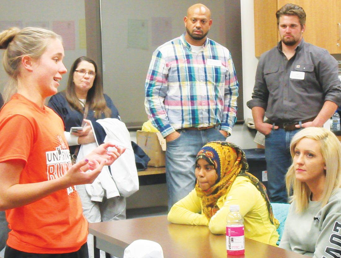 Photo by Karin Elton Marshall High School student Rachel VanKeulen talks to visitors from Faribault about why she likes taking a certified nursing assistant class with adults from the Marshall community.