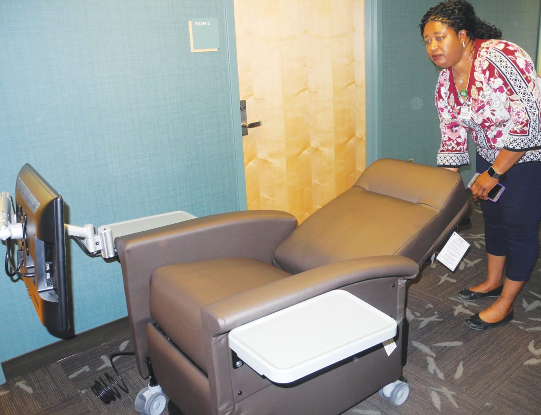 Photo by Deb Gau Lillian Onyeaghala, dialysis manager at Avera Marshall Regional Medical Center, demonstrated some of the features of the chairs for the hospital’s new dialysis center. Patients with kidney disease sit in the chairs while their blood is filtered by specialized equipment.