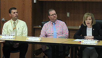 Photo by Deb Gau From left to right, Marshall High School Principal Brian Jones, Director of Teaching and Learning Jeremy Williams, and Sen. Tina Smith joined in the conversation at a roundtable on mental health care needs on Thursday afternoon. This year, Smith introduced legislation aimed at funding mental health services for schools.