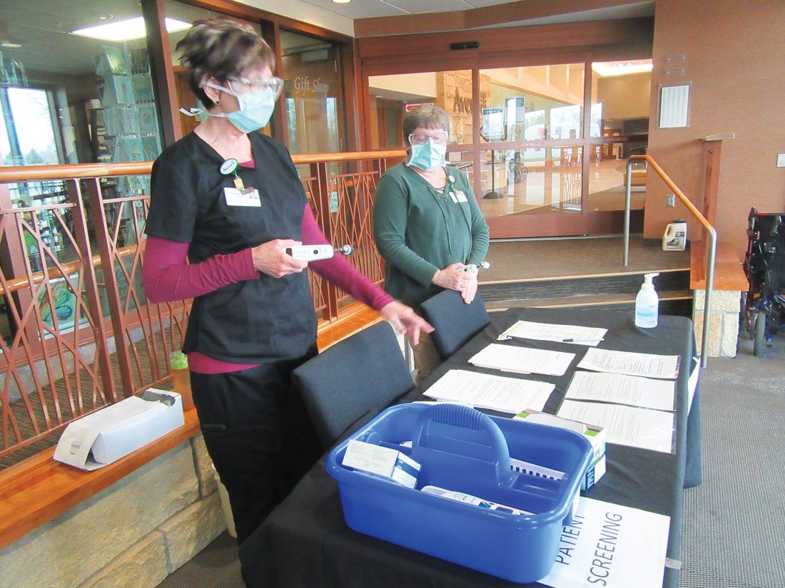 Photo by Deb Gau On Monday, Lori Dragstra and Pam Wiering explained the screening process now in place for everyone entering Avera Marshall Medical Center as part of COVID-19 and influenza prevention. Patients and visitors have their temperature checked, and are asked if they have had a fever of 100 degrees or higher, a cough or shortness of breath over the past two weeks. Avera is also limiting the number of visitors in its facilities, to help protect patients and healthcare workers.