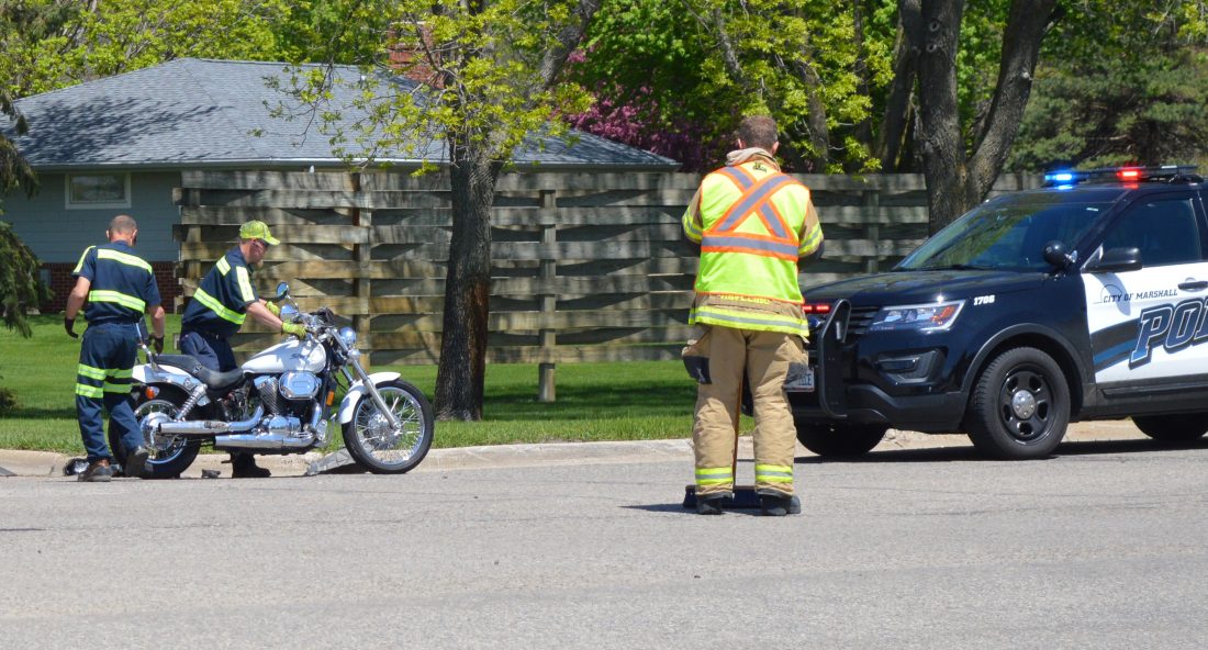 A two-vehicle crash involving a motorcycle was reported near the intersection of Country Club Drive and Devito Street, around noon. Emergency medical responders transported one person from the crash scene via ambulance. Marshall Police, the Marshall Fire Department and North Memorial Ambulance all responded at the scene.