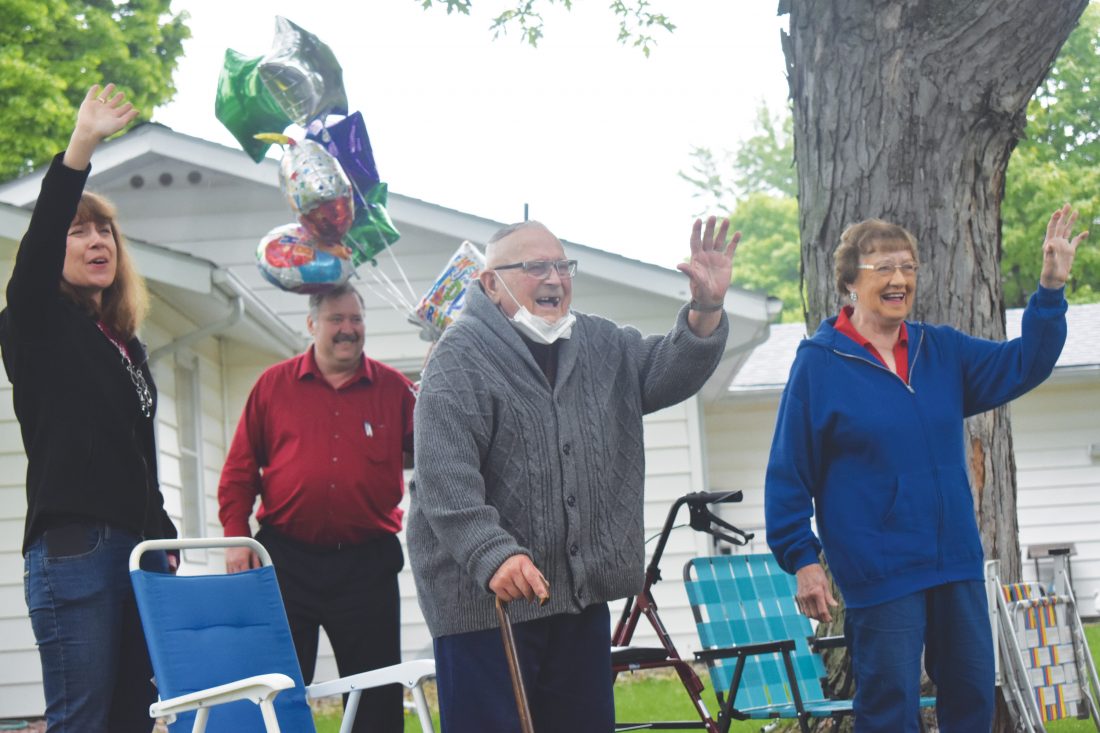 Photo by Sam Thiel Willy Hoffmann, middle, waves to family members as they wish him happy birthday on Tuesday outside of his home in Marshall.