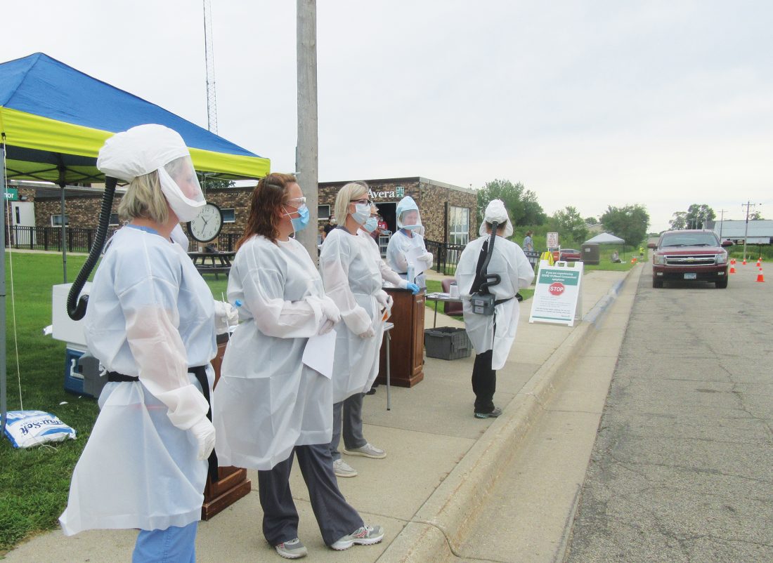 Photos by Deb Gau Medical workers donned protective gear and waited at the curb outside the Avera Tyler hospital on Wednesday, as a line of people drove up to have nasal swabs collected for COVID-19 testing. The community testing event was organized when Lincoln County saw a spike in positive COVID-19 cases after the 4th of July weekend.