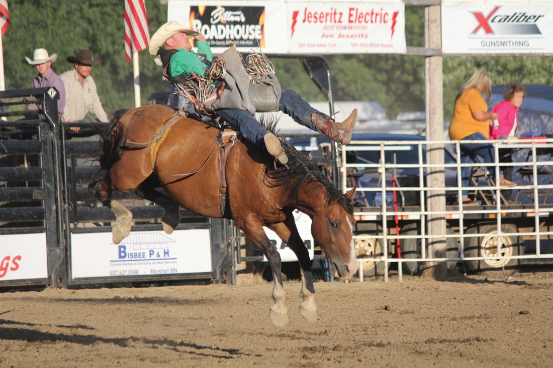 Brian Dittmer of Runnells, Iowa competes in the bareback riding event during the PRCA Rodeo at the Lyon County Fair Friday.