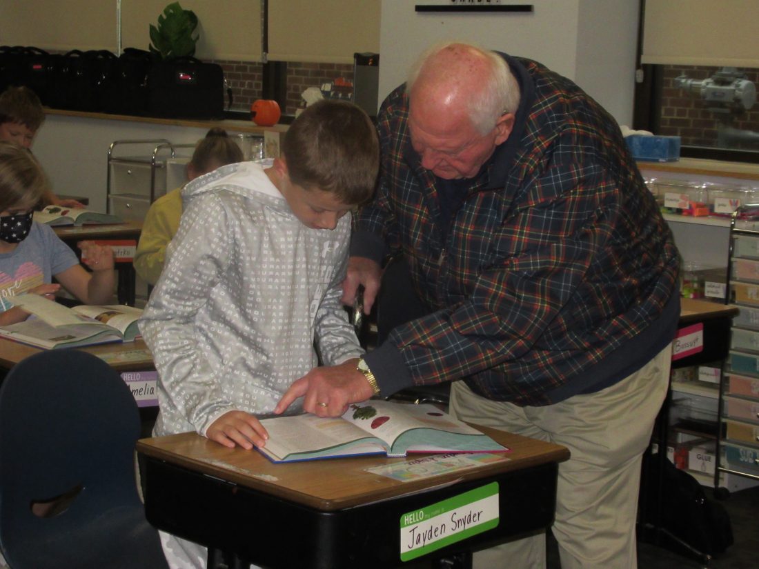 Students in the third grade at Marshall public and private schools received dictionaries from Marshall Rotary members on Thursday. Along with their own dictionaries, students learned a little about the Rotary’s goals and the importance of community service. Above: After distributing dictionaries to third graders at Holy Redeemer School on Thursday morning, Bob Aufenthie helped students use their dictionaries to look up and define the word “service.”
