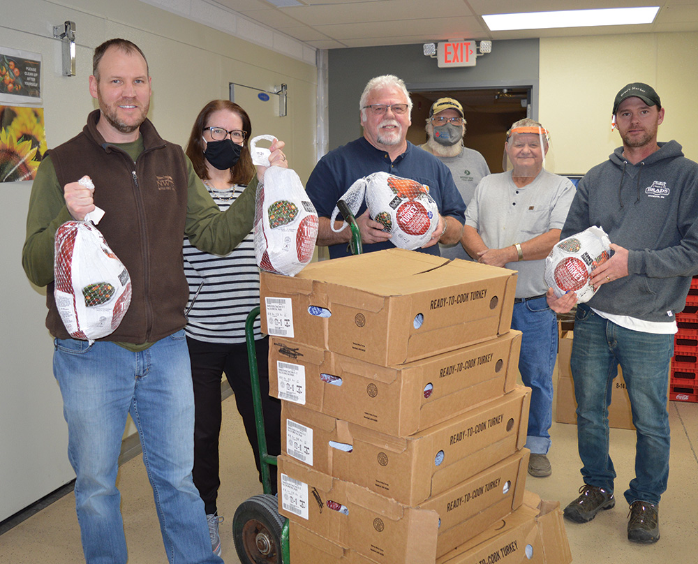 Representatives of the Buffalo Ridge Gobblers and Brad’s Market delivered more than 300 pounds of turkey to the Kitchen Table Food Shelf in Marshall on Monday. From left to right, Joe Hasse of the Buffalo Ridge Gobblers, Marcia Sik, Chuck Freiss, Steve Hammer and Dick Williams of the Kitchen Table Food Shelf, and Brad Minnehan of Brad’s Market wheeled in a donation of 28 turkeys for area residents in need.