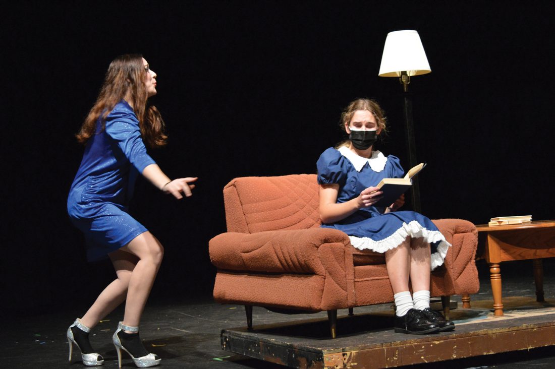 Photo by Deb Gau Mrs. Wormwood, played by Layne Ziemer, reacts with shock to discover her 5-year-old daughter Matilda, played by Brenna Springborg, reading books.