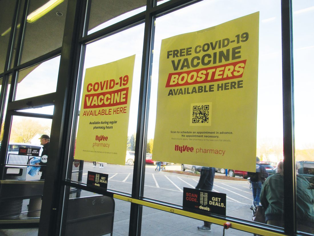 Photo by Deb Gau Signs posted in the windows at the Marshall Hy-Vee this week advertised COVID-19 vaccinations. New federal rules say employers with 100 or more employees will need to make sure their workers are vaccinated against COVID by Jan. 4. Hy-Vee is among the Marshall area businesses and public institutions that would be affected by the new requirements.