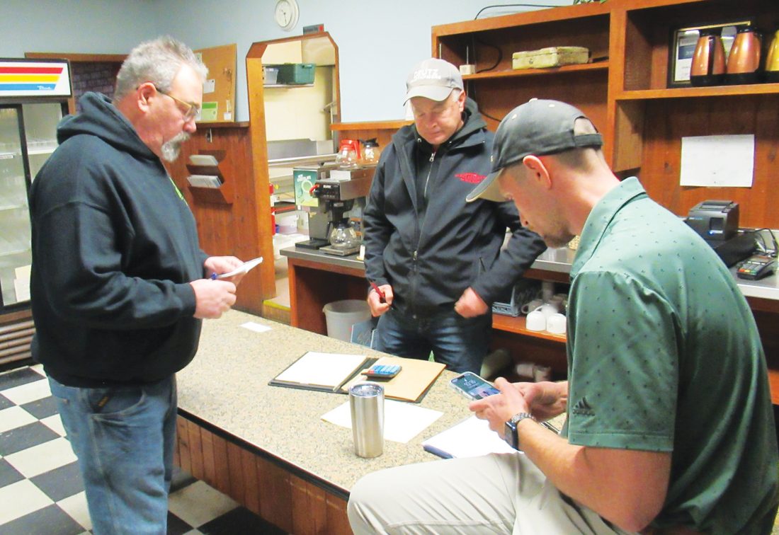 Photo by Jim Muchlinski New Corner Cafe owner Blaine Foreman (left) signs ownership papers with Deutz Auctioneers after purchasing the cafe in Tuesday’s auction. Foreman paid $20,000 as the only bidder. The sale includes all equipment, furnishings and a vehicle that was used for catering.