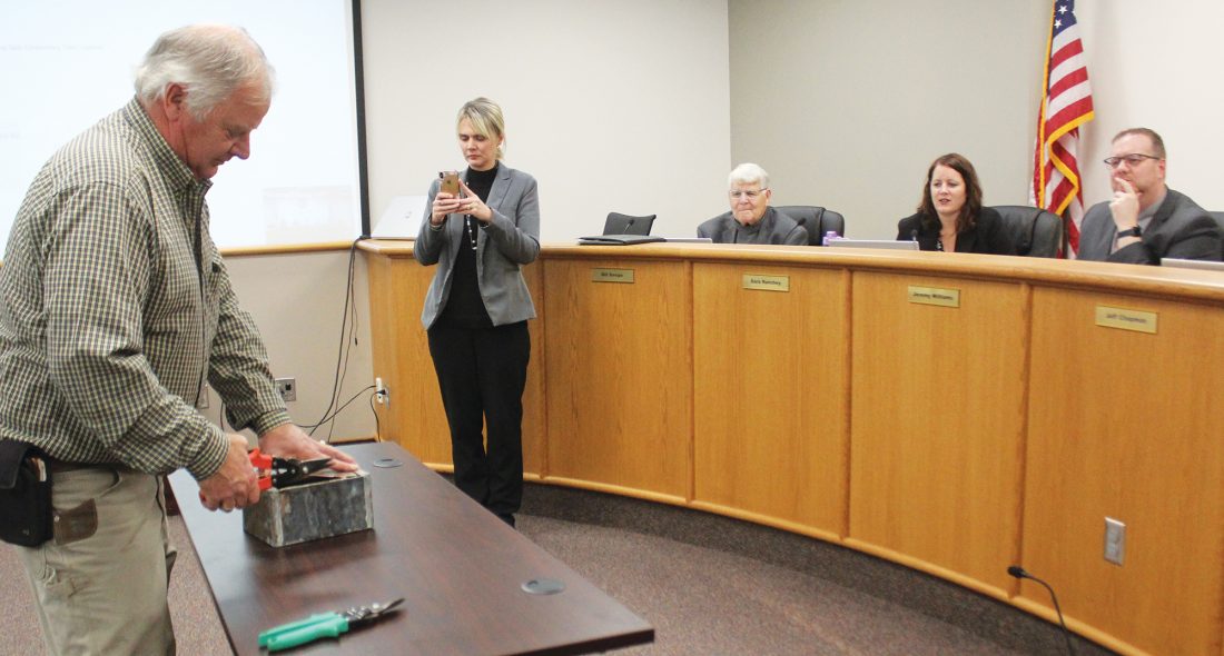 At their regular meeting this week, members of the Marshall School Board watched as MPS building and grounds supervisor Warren Buchholz cut open the metal time capsule with shears.