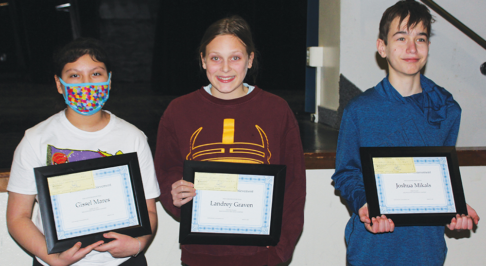 As Pedersen called out the names of Joshua Mikals, Landrey Graven and Gissel Mares, students clapped and cheered. Mikals won first place in the Rotary contest, with Graven and Mares winning second and third place. Members of the Marshall Noon Rotary Club presented the three students with certificates.