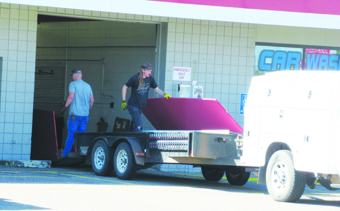 Photo by Deb Gau Storm-damaged panels from the canopy at the Cenex ExpressWay gas station in Marshall were loaded onto a trailer for removal Tuesday morning. The Cenex ExpressWay will be closing at the end of operating hours today, said Dan Ortmann, director of retail operations for Staples Enterprises.