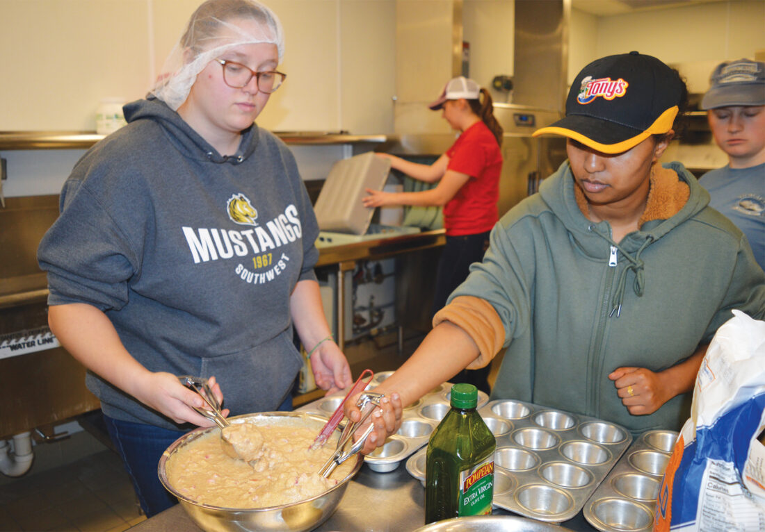 Photo by Deb Gau SMSU students Bailey Gluth and Betty Mekuria use ice cream scoops to portion out the batter for a batch of strawberry muffins for the Mindful Meals program.