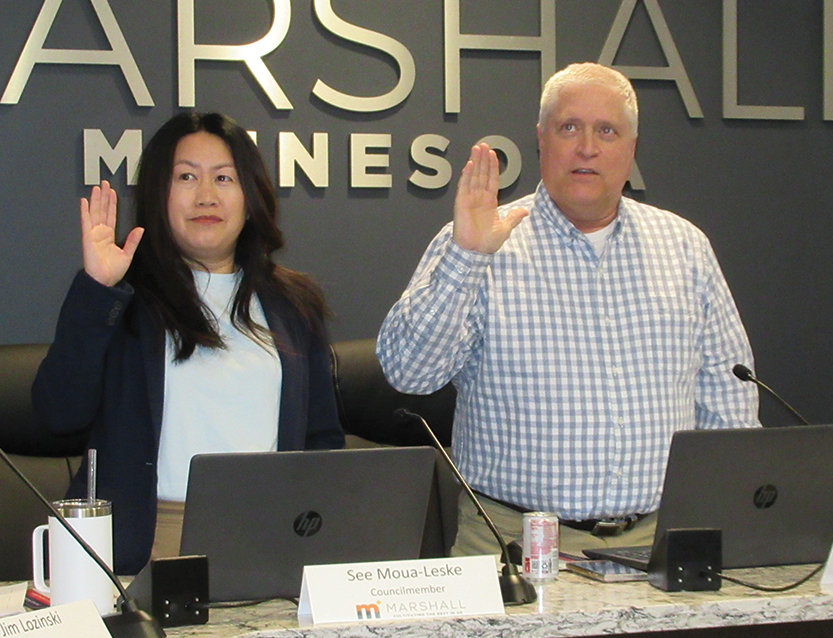 Photo by Deb Gau New Marshall City Council members See Moua-Leske and John Alcorn took their oath of office at Tuesday’s council meeting. Moua-Leske will be representing Marshall’s Ward 2, and Alcorn will be representing Ward 1.