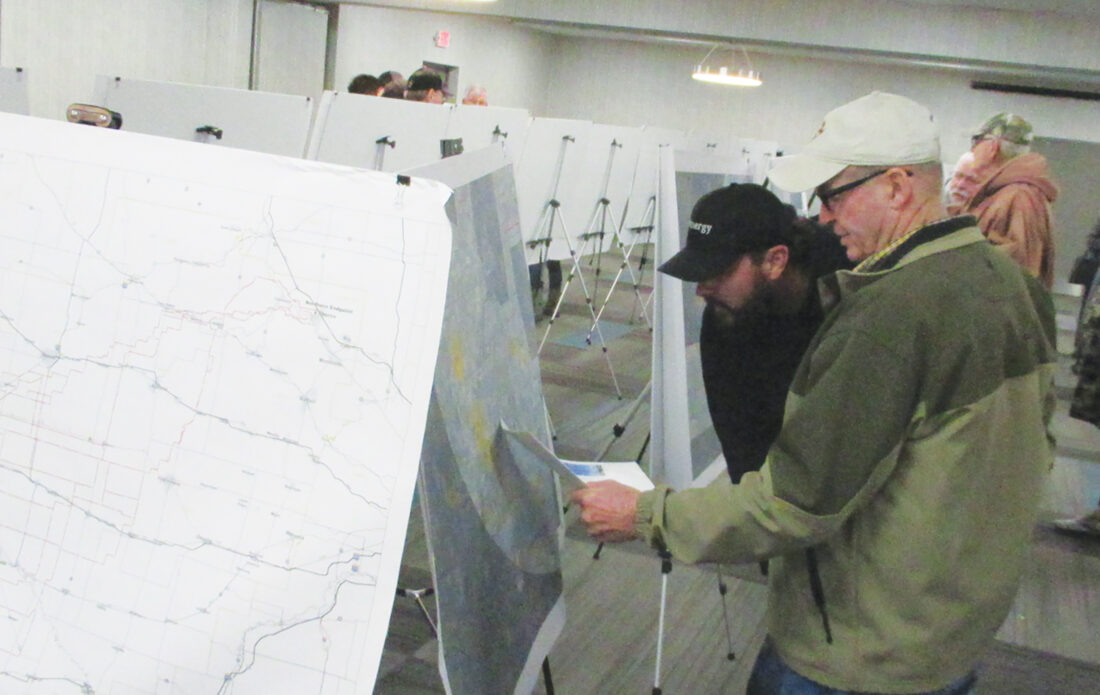 Photo by Deb Gau Members of the public take a closer look at maps with proposed routes for a new 345-kilovolt power line that would connect a substation near Becker with renewable energy sources in southwest Minnesota during a Xcel open house Monday in Marshall.
