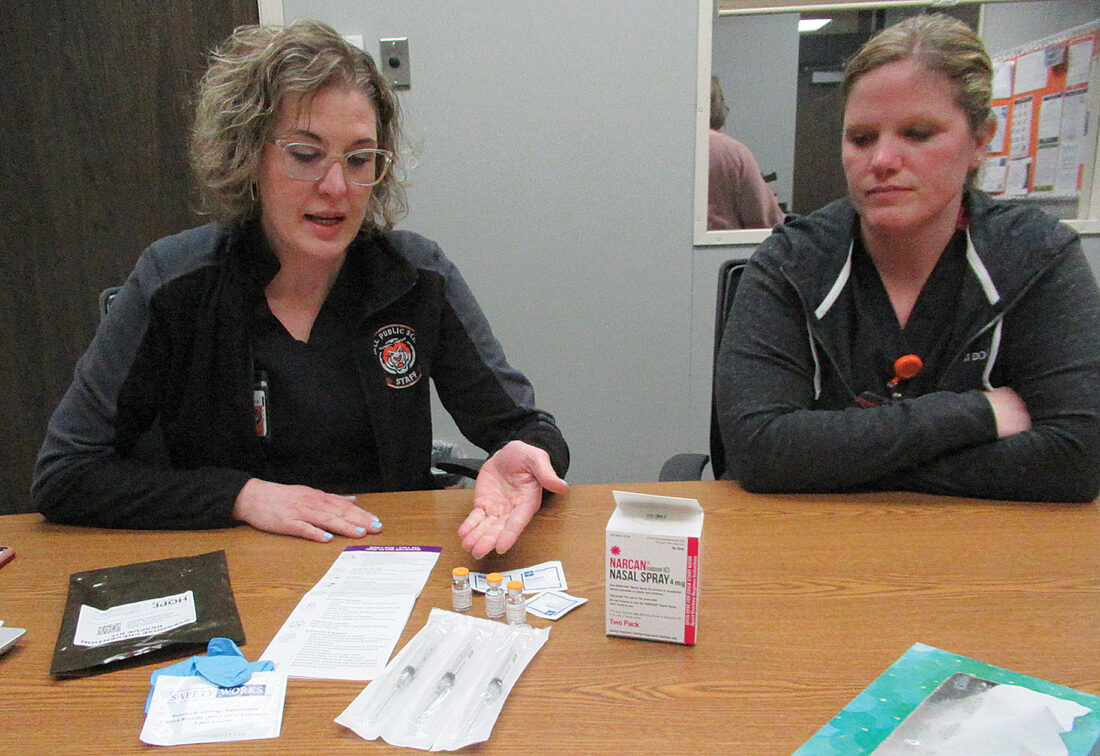 Photo by Deb Gau Marshall Middle School nurse Danielle Brandt and health office aide Erin Moline explained what was in the emergency naloxone kits that MMS received this month.