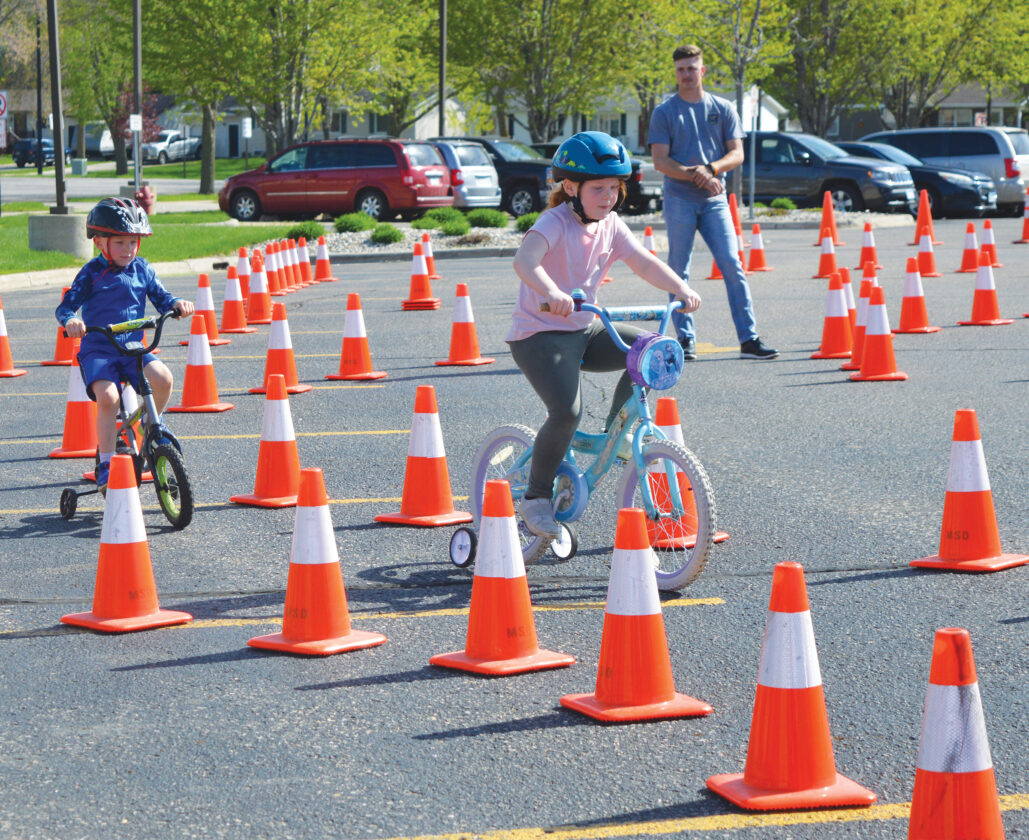Photo by Deb Gau Pacey Rieke and Charlotte Baumann enter the home stretch of a bicycle riding course set up at the Bike Safety Extravaganza outside the Marshall Area YMCA on Monday