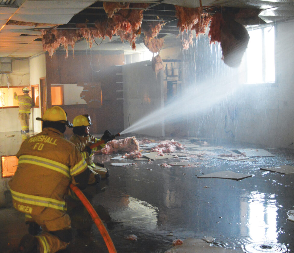 MARSHALL — The empty building on East College Drive had already had a couple of new uses this spring, like an art canvas and law enforcement training grounds. Now it was the Marshall Fire Department’s turn to go inside.
