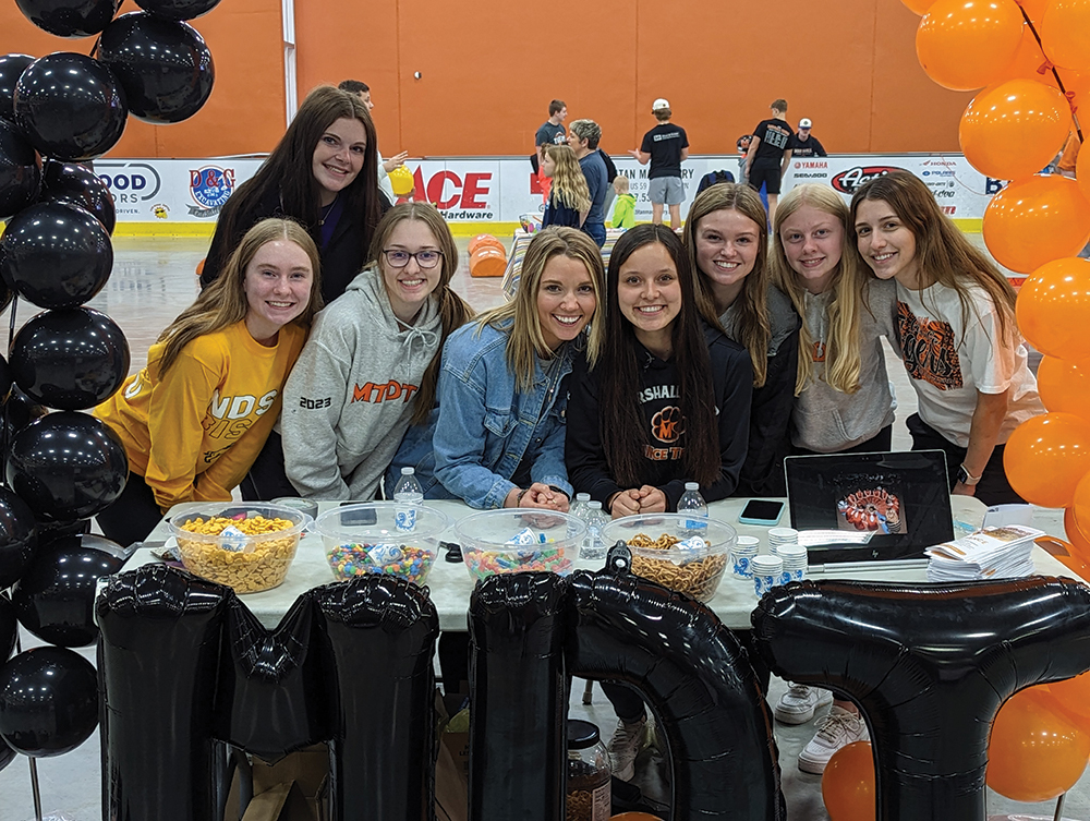 Photo by Chris Drummond Members of the Marshall Dance team with coaches Lexi Wolf and Toni Vorvick promote the team during the Youth Sports and Activity Expo on Saturday.