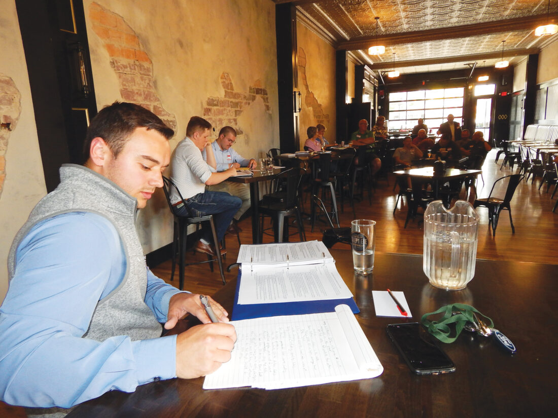 Photo by Fritz Busch Loren Dauer, District 1 outreach representative for Congressman Brad Finstad, takes notes Tuesday at a Farm Bill Listening session at Sleepy Eye Brewing Co.