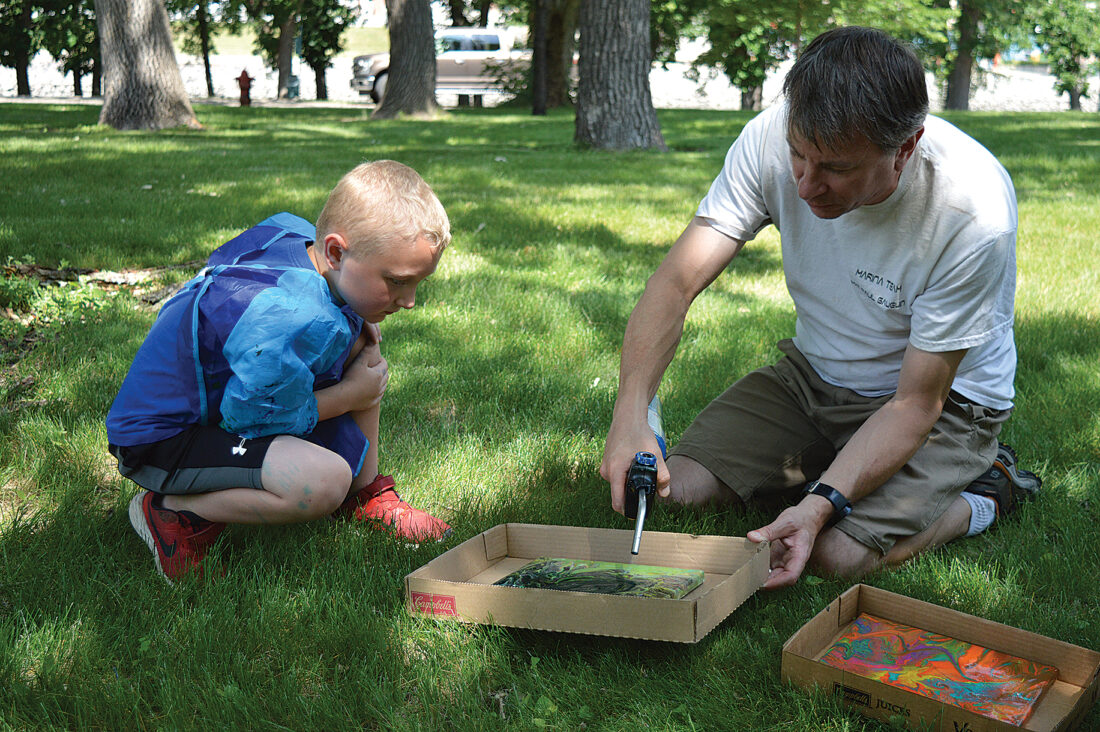 Photos by Deb Gau Above: Hayden Bremmer watched as Mark Weberg used a small torch to bring out bubbling patterns in Hayden’s painting. The “paint pour” event was one of the free activities kids could take part in at Granite Falls’ Western Fest on Thursday
