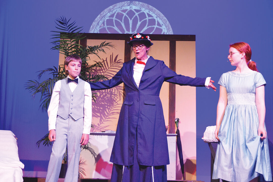 Photo by Deb Gau Mary Poppins, played by Sara Vogt, gets acquainted with Michael and Jane Banks, played by Jacob Christensen and Sidney Court, in a scene from “Mary Poppins.” The musical opens Thursday night at the Lake Benton Opera House.