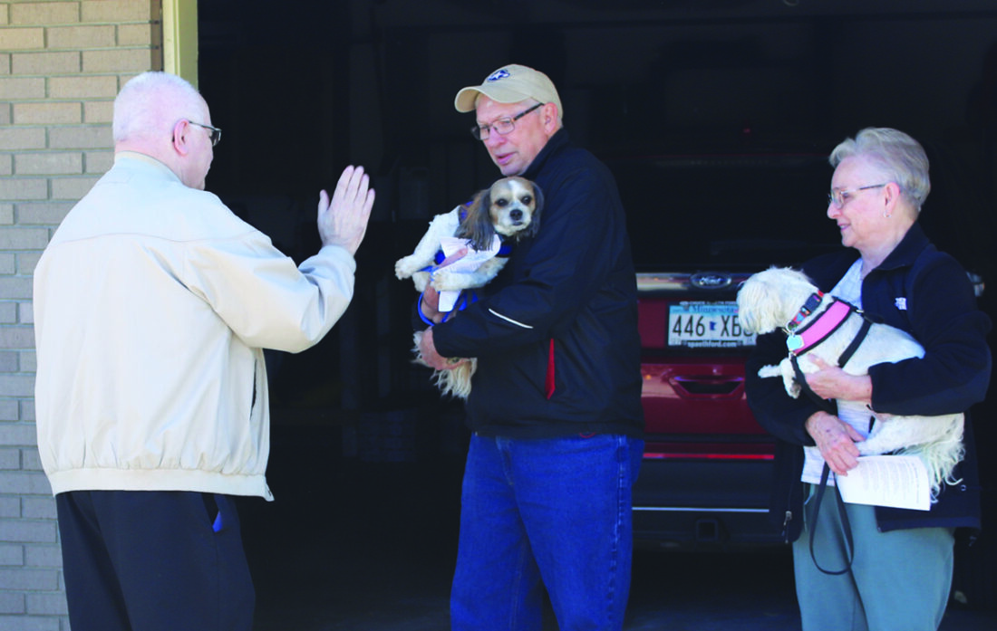 Don and Sharon Kinker hold their two dogs Lexi and Muffy as Rev. Dennis Labat blesses them during the pet blessing outside Holy Redeemer Church on Sunday. The pet blessing is sponsored by the Little Portion Secular Franciscans of the Marshall area.
