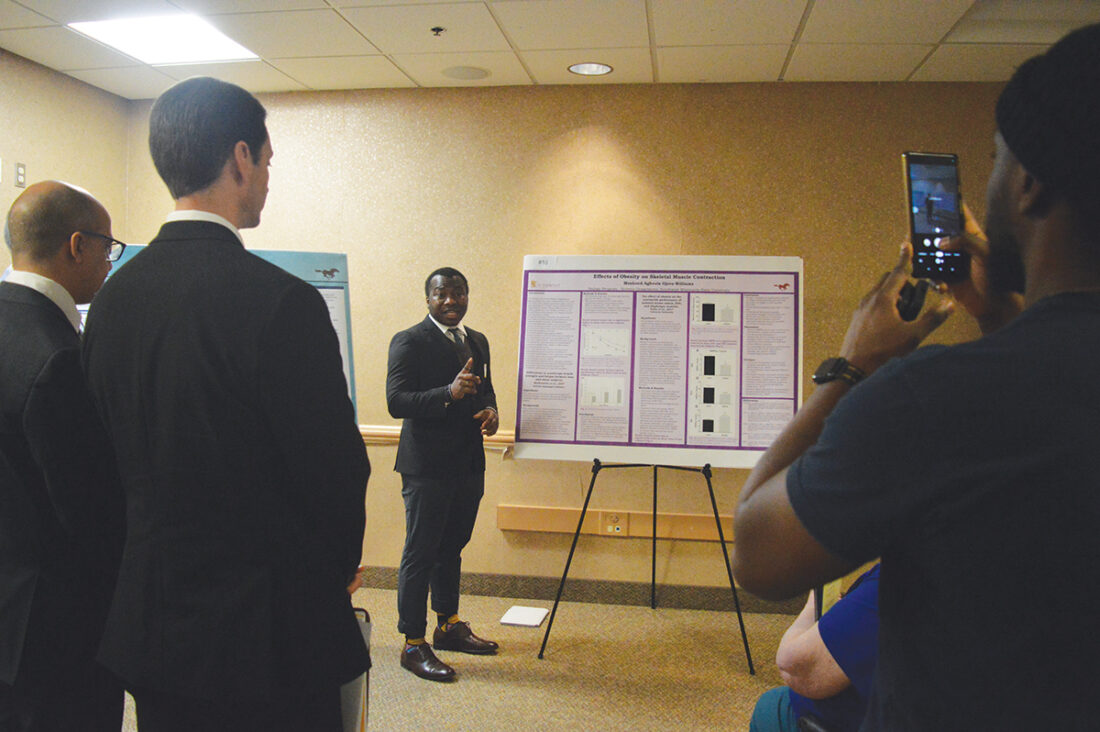 Photo by Deb Gau A crowd of SMSU students and faculty gathered around Moshood Agboola Ojora-Williams as he spoke about the results of a biology study he conducted. A total of 128 SMSU students presented research projects at the annual Undergraduate Research Conference.