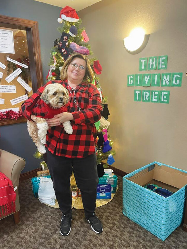 Photo courtesy of Jan Mason Boulder Creek Director Jan Mason stands in front of the Giving Tree holding Jazzy inside the Boulder Creek lobby. The tree is decorated with knitted winter clothing that will be given away after the holidays.