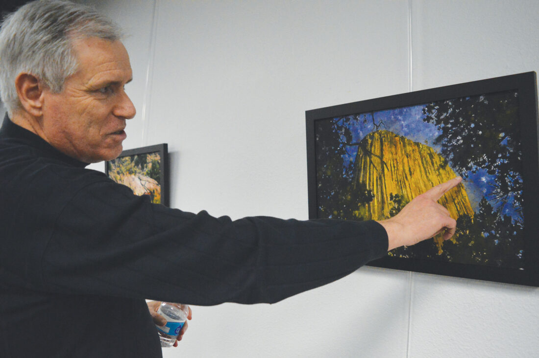 Photo by Deb Gau Artist Alma Hale explains how he used the computer program Photoshop to turn his digital photography into a collection of images that look like watercolor paintings. An exhibit of Hale’s work is currently running at the MAFAC gallery in Marshall.