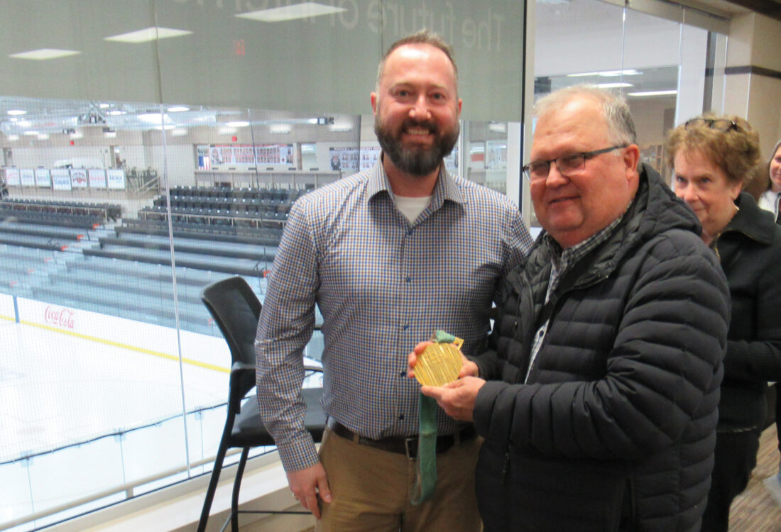 Photo by Jim Muchlinski Tyler George of Duluth, left, shows off his Olympic gold medal to one of the attendees at the Marshall Area Chamber of Commerce speaker series event at the Red Baron Arena Wednesday. George’s team won gold at the 2018 Olympic Games in South Korea.