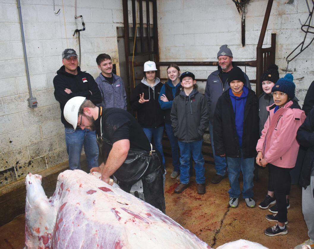 Photo courtesy of Sam Jens A group of 18 Lyon County 4-H members recently got a chance to observe how beef is butchered during a tour of the V&M Locker in Leota. Area youth learned more about the meat processing business, as well as how meat products are packaged and marketed for V&M’s retail store.