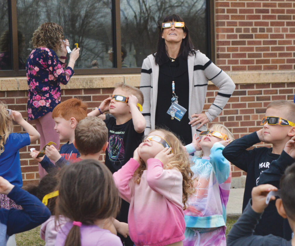 Photos by Deb Gau Teachers like Heidi Aufenthie, and preschoolers at Holy Redeemer School headed outside with special viewing glasses to try and see Monday’s solar eclipse. Through gaps in Monday’s clouds, it was possible to catch a glimpse of the moon’s silhouette passing in front of the sun in Marshall.