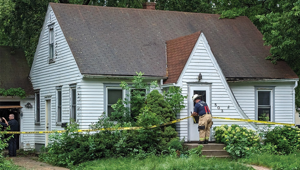 Photo by Mike Lamb Marshall firefighters put caution tape around a house where a kitchen fire was put out on Saturday afternoon.