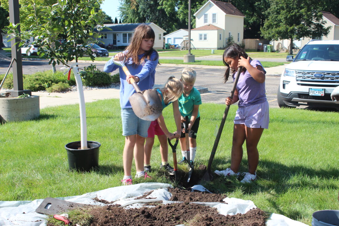Photo by Samantha Davis. The YMCA kid’s garden club worked to plant an apple tree with the University of Minnesota Master Gardeners of Lyon County Tuesday morning in the front lawn.