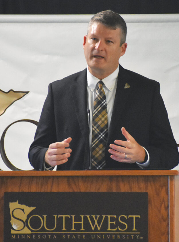 Photo by Samantha Davis Southwest Minnesota State University interim president Dr. David Jones gives the annual state university address Friday morning on campus. He discussed university topics like enrollment, highlights and strategic planning.