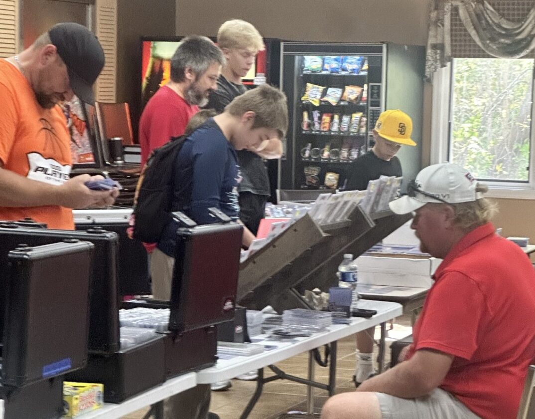Photo by Samantha Davis: Local community members take a look over a variety of cards and collectible memorabilia at a card show at the Adult Community Center in Marshall Saturday afternoon.