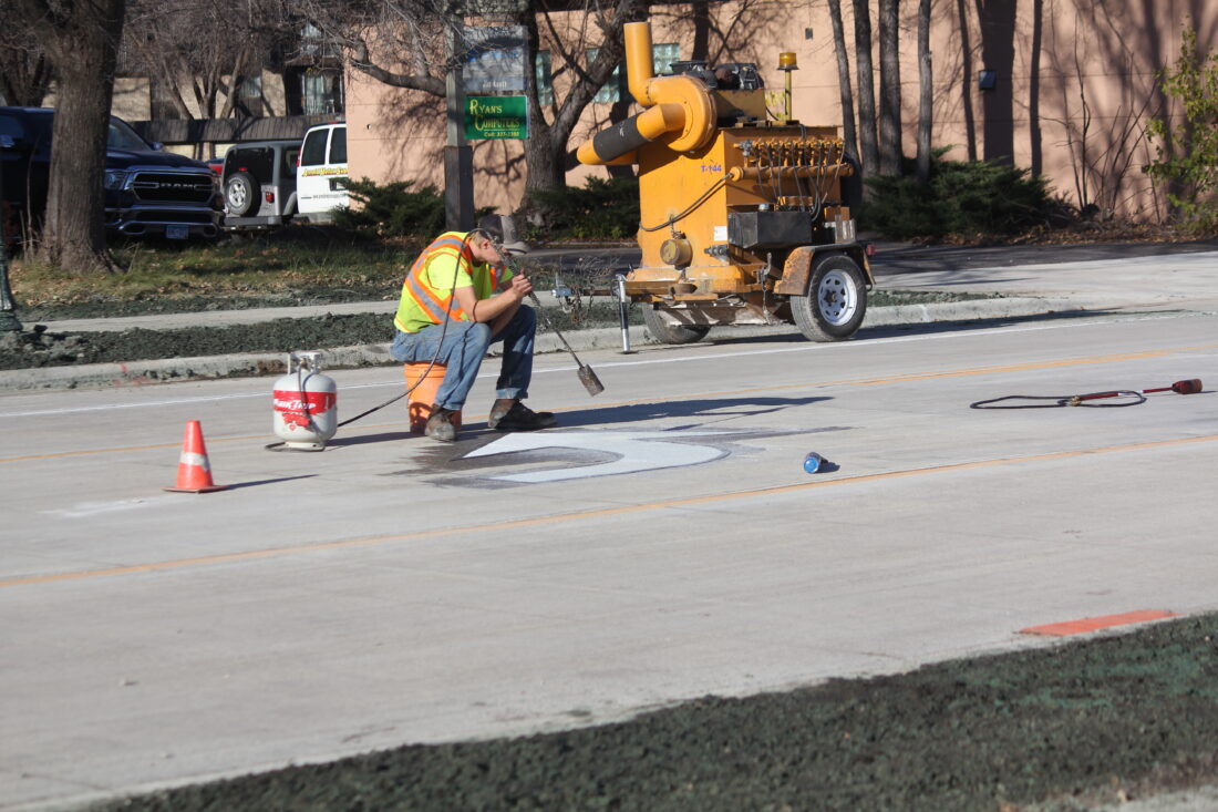 Workers were installing road markings along portions of Highway 19 in Marshall on Wednesday. Construction on Highway 19 (West College Drive) continues, with contractors focused on tasks ranging from landscaping to pouring sidewalks.