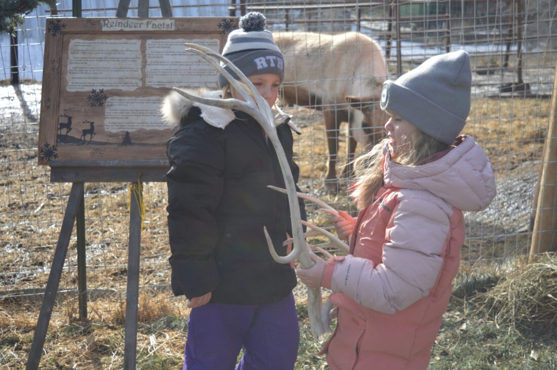 Kids and families stood by the fence around Red Stable Reindeer’s pen to watch reindeer Mika, Stella and Memphis. They also checked out displays of reindeer facts, and visitors like Adley Thooft and Clara Dressen got a chance to hold a shed antler.