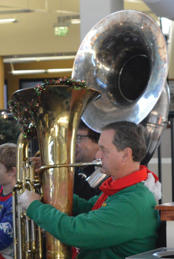 Photo by Deb Gau Tubas, euphoniums, a sousaphone and more made up the band at Saturday’s TubaChristmas concert at SMSU. A total of 39 musicians from across southwest Minnesota gathered to play Christmas carols.