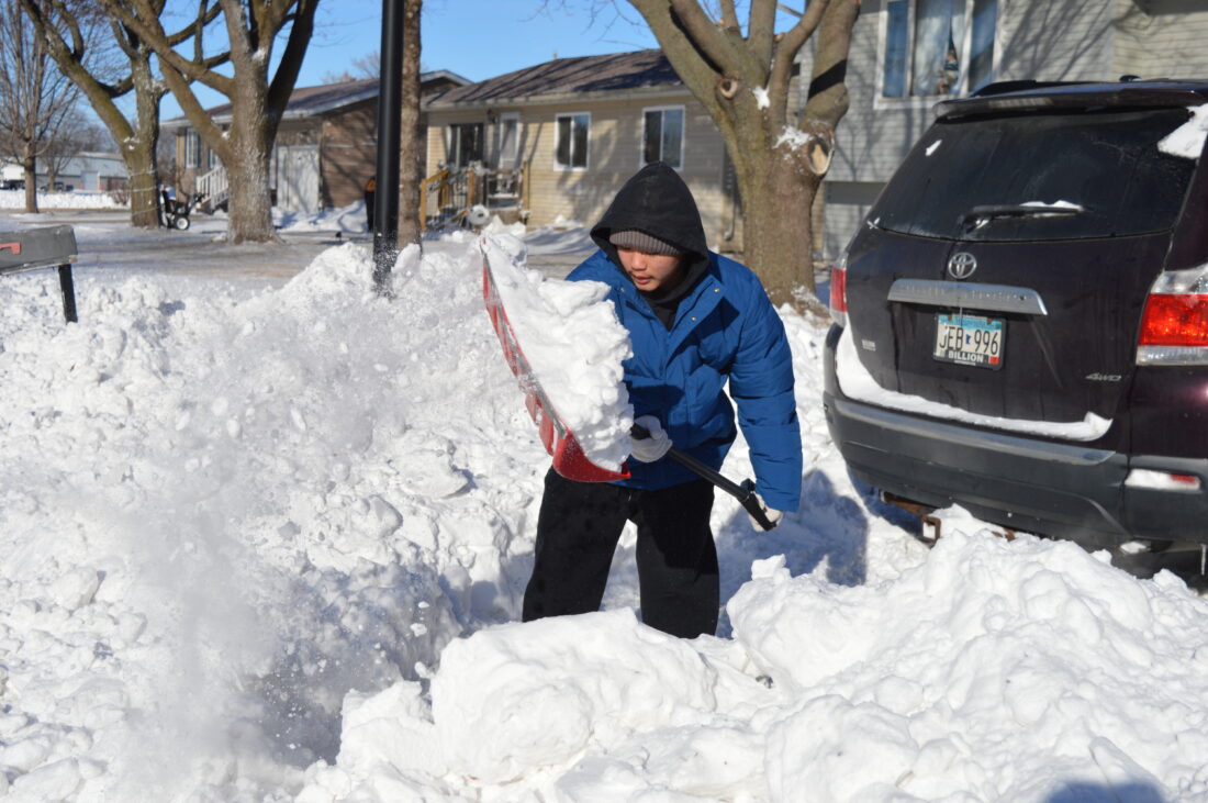 Marshall residents were cleaning up after about 4 inches of drifting snow fell on the area over the weekend. Ehmu Soe shoveled out the end of a driveway on Monday.